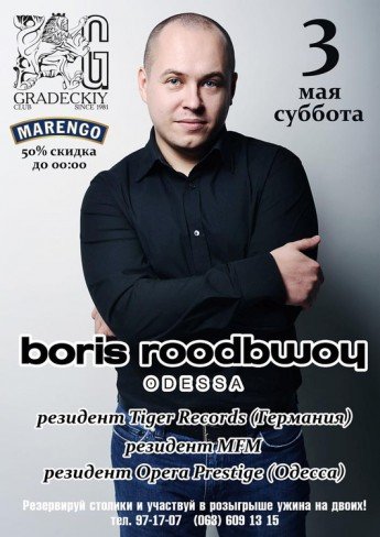 Борис Рудбой – одесский ди-джей международного уровня! Начав в 2000г, он проработал резидентом лучших заведений Одессы, а сейчас является ди-джеем элитарных клубов Opera Prestige и Nikki Beach. Борис регулярно играет несколько раз в неделю, при этом часто за пределами Украины – Монако, Люксембург, Франция, Швейцария, Германия и тд. Отдельно стоит отметить его участие в качестве гостя вечеринок Hed Kandi, а также ивентов таких брендов, как Merceds-Benz, Armani, Canali, Brioni итп. Boris Roodbwoy подписан на один из крупнейших House лейблов мира – Tiger Records (Германия). Также он издавался на Spinnin, Milk&Sugar, Pacha, Housesession, CR2, Mjuzieek и многих других известных лейблах. Его треки регулярно попадают в разные чарты, включая авторитетный Beatport Top 100. Roger Sanchez, NERVO, David Vendetta, Milk&Sugar, Plastik Funk, Supafly Inc - неполный список звезд, играющих треки Бориса. Отдельно стоит отметить его радио-шоу на украинских радиостанциях Просто Ради.О и MFM. А его международное радио шоу Dance Club Mix еженедельно выходит на волнах более 20 радиостанций по всему миру! Boris Roodbwoy играет House во всех своих проявлениях - от модных эксклюзивных треков до популярных хитов в зависимости от публики и музыкальной политики заведения.