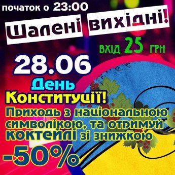 Приходи с какой-либо украинской атрибутикой и получи коктейль по 50% скидке!