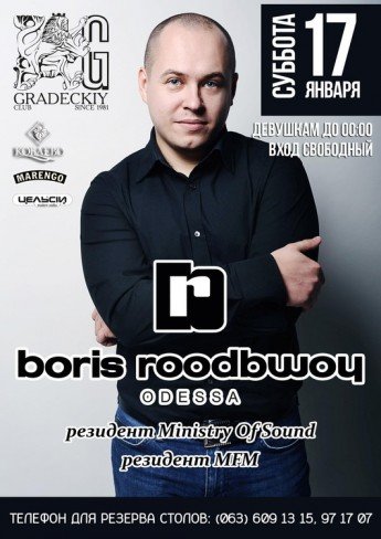 Специальный гость - Борис Рудбой – одесский ди-джей международного уровня! Начав в 2000г, он проработал резидентом многих знаменитых клубов Одессы. Сейчас Борис - резидент одного из лучших летних клубов Украины - Bono Beach Club, а также постоянный гость таких известных одесских заведений, как Ibiza, Ministerium, Opera Prestige, Morgan Club и тп. Борис регулярно играет несколько раз в неделю, при этом часто за пределами Украины – Монако, Люксембург, Франция, Швейцария, Австрия, Германия, Чехия и тд. Отдельно стоит отметить его участие в качестве гостя вечеринок Hed Kandi, а также ивентов таких брендов, как Merceds-Benz, Fashion TV, Armani, Diesel итп. Boris Roodbwoy подписан на один из крупнейших House лейблов мира – Tiger Records (Германия). Также он издавался на Spinnin, Milk&Sugar, Pacha, Housesession, CR2 и многих других известных лейблах. Его треки регулярно попадают в разные чарты, включая авторитетный Beatport Top 100. Roger Sanchez, NERVO, David Vendetta, Ronn Carroll, Milk&Sugar - лишь небольшой список звезд, играющих треки Boris Roodbwoy. Отдельно стоит отметить его радио шоу, которое еженедельно выходит на волнах более 20 радиостанций по всему миру, а также популярные программы Просто Dance Club и Просто Dance Chart в эфире хит-станции номер 1 в Украине - Просто Ради.О (Киев). Стиль Boris Roodbwoy - House во всех своих проявлениях, от эксклюзивных модных треков до популярных хитов!