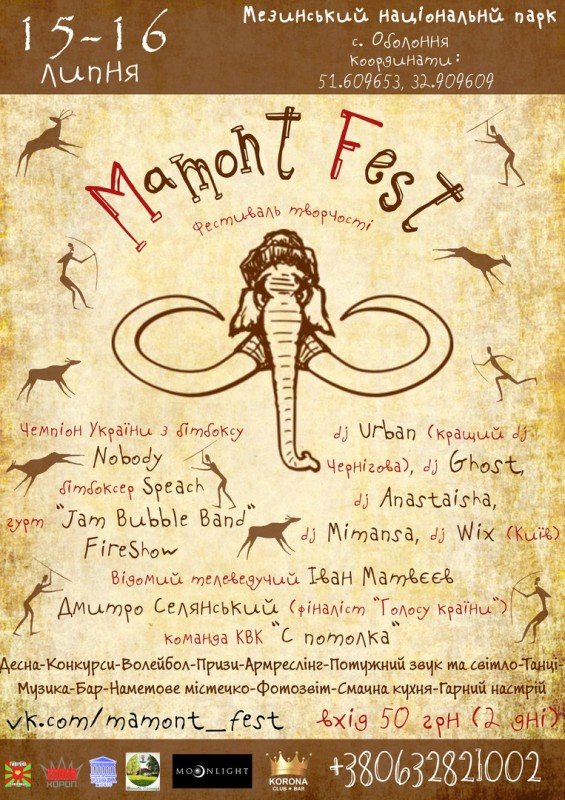 Приглашаем Вас на фестиваль истории творчества "Мамонт Фест 2016". Он будет проходить 15-16 июля на территории Мезинского национального парка, возле с. Оболоння в живописном уголке Черниговской области на берегу реки Десна.