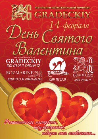 Ресторанно-развлекательный комплекс "Градецкий" поздравляет всех влюбленных с Днем Святого Валентина и приглашает отметить его в своих заведениях"
