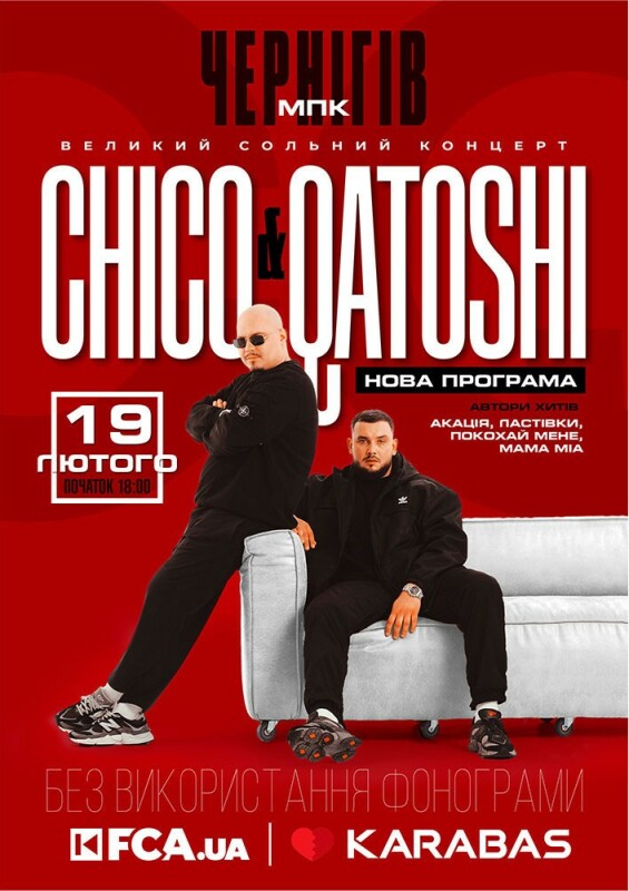 Вже зовсім скоро Chico & Qatoshi дають свій сольний концерт у вашом місті , де разом з вами заспівають улюблені хіти та нові пісні.