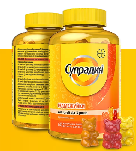 Витамины являются неотъемлемой частью здорового рациона питания и играют важную роль в развитии детей (1). Они не только поддерживают нормальную работу всех функций организма, но и влияют на физическое и психическое развитие ребенка. Витаминный комплекс Супрадин, который дети Украины знают, как «ведмежуйки», имеет в воставе широкий спектр полезных веществ, необходимых для правильного роста и формирования органов и систем детей.