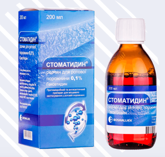 - Стоматидин при ангине — раствор помогает снизить болевые ощущения и уменьшить воспаление.