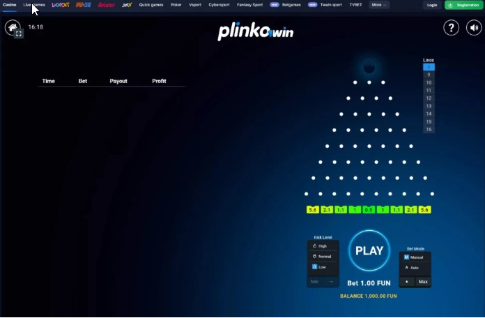 Plinko – это вертикальное поле для игры с колышками. Сверху вниз по этому полю с колышками скатывается специальный шарик. Игра основывается на законах физики с элементом случайности. За счет этого каждый отдельный раунд является непредсказуемым и уникальным.