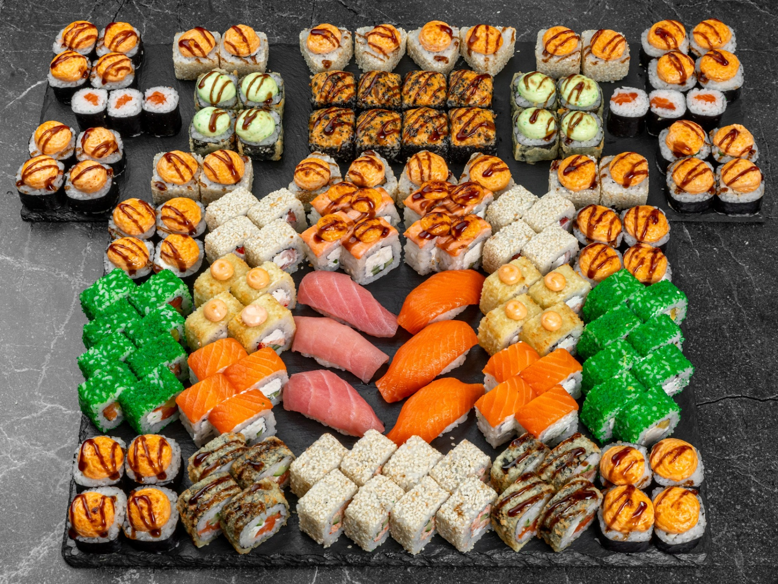 - Сеты на компанию. Большие наборы суши на корпоратив, которые включают несколько видов роллов, чтобы угодить каждому.