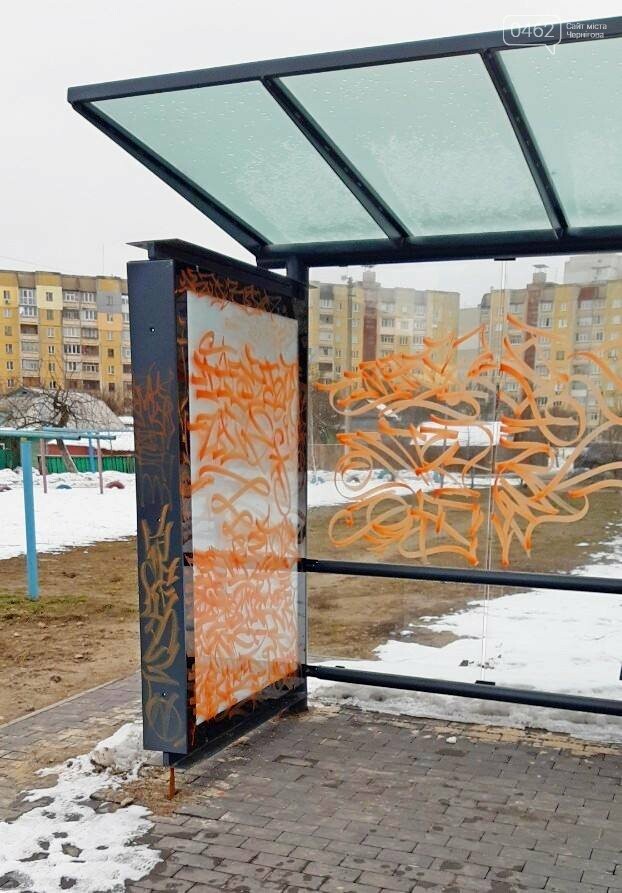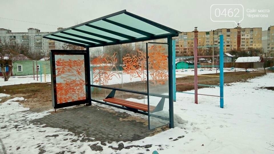 Неизвестные вандалы ночью полностью обрисовали остановку общественного транспорта на улице Полуботка недалеко от дома №73 (район педуниверситета).