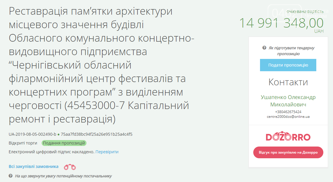 Зовсім незабаром у Чернігові мають відреставрувати пам'ятку архітектури місцевого значення, а саме - Чернігівський обласний філармонійний центр фестивалів та концертних програм. Тендер на ці роботи вже оголосили у системі Prozorro.