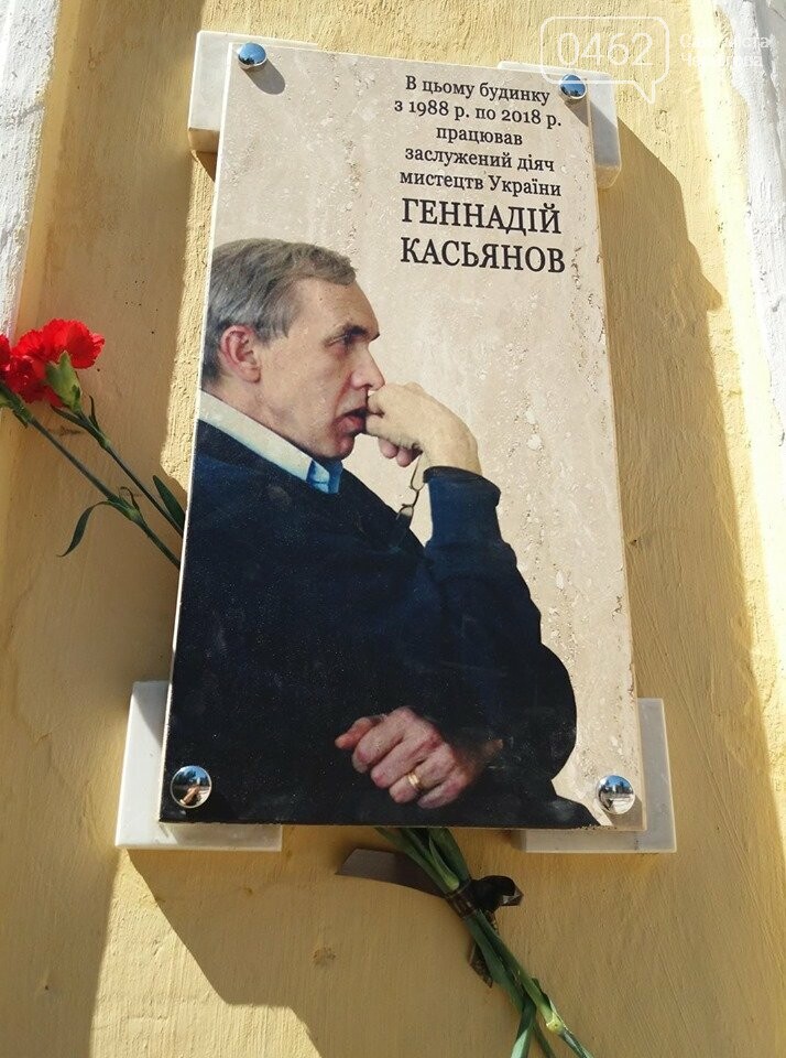 На дошці – портрет Геннадія Касьянова та інформація про те, що він працював в театрі з 1988 по 2018 роки.