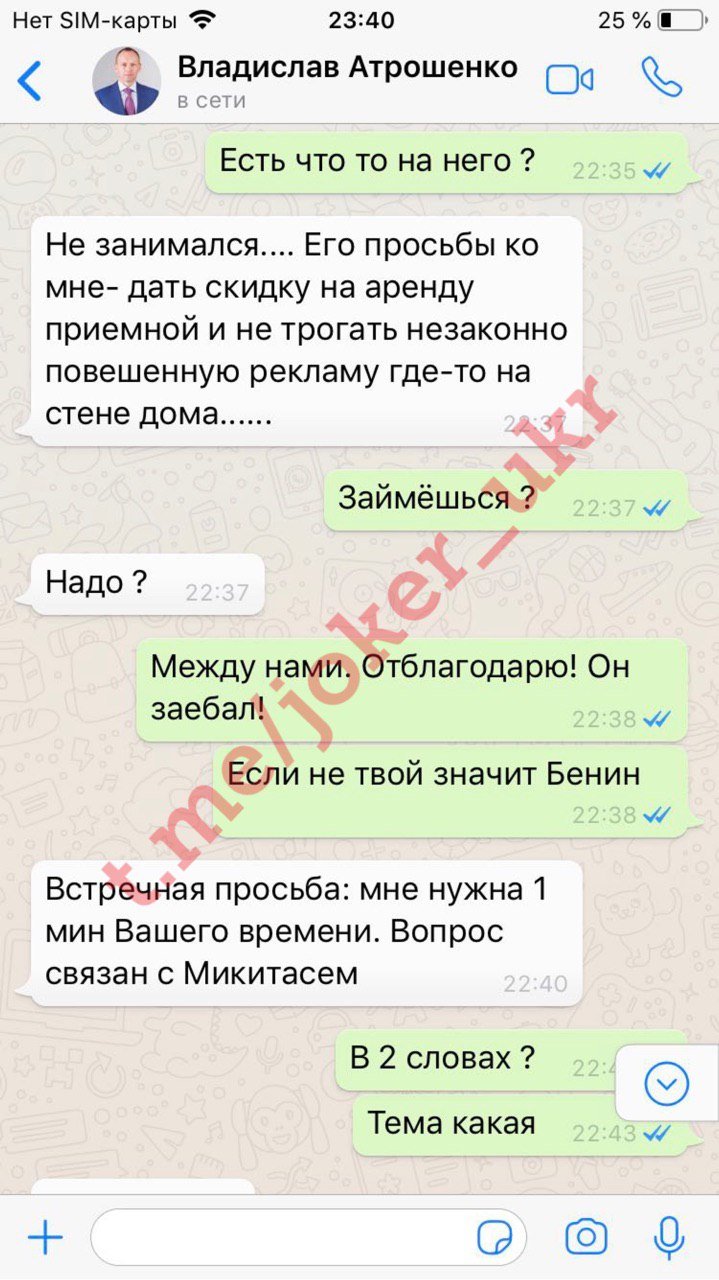 – В переписці Джокер просить Владислава Атрошенка зняти рекламу магазина Антона Полякова, та підняти оренду за приймальню…