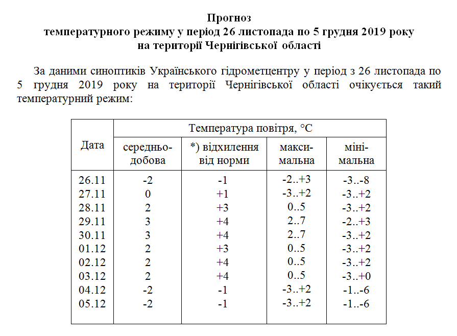 Детальний прогноз на 26 листопада - 05 грудня по Чернігівській області: