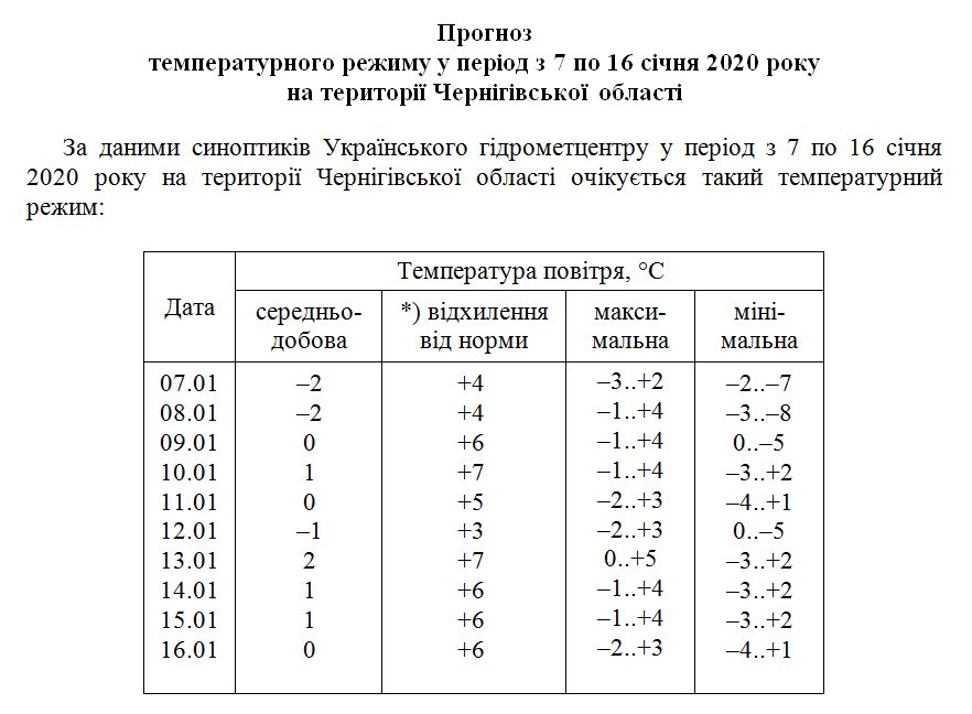 Детальний прогноз погоди по Чернігівській області на 7 січня - 16 січня: