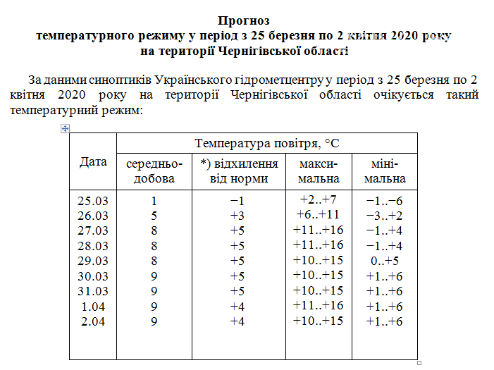 Детальний прогноз погоди по Чернігівській області на період з 25 березня по 2 квітня: