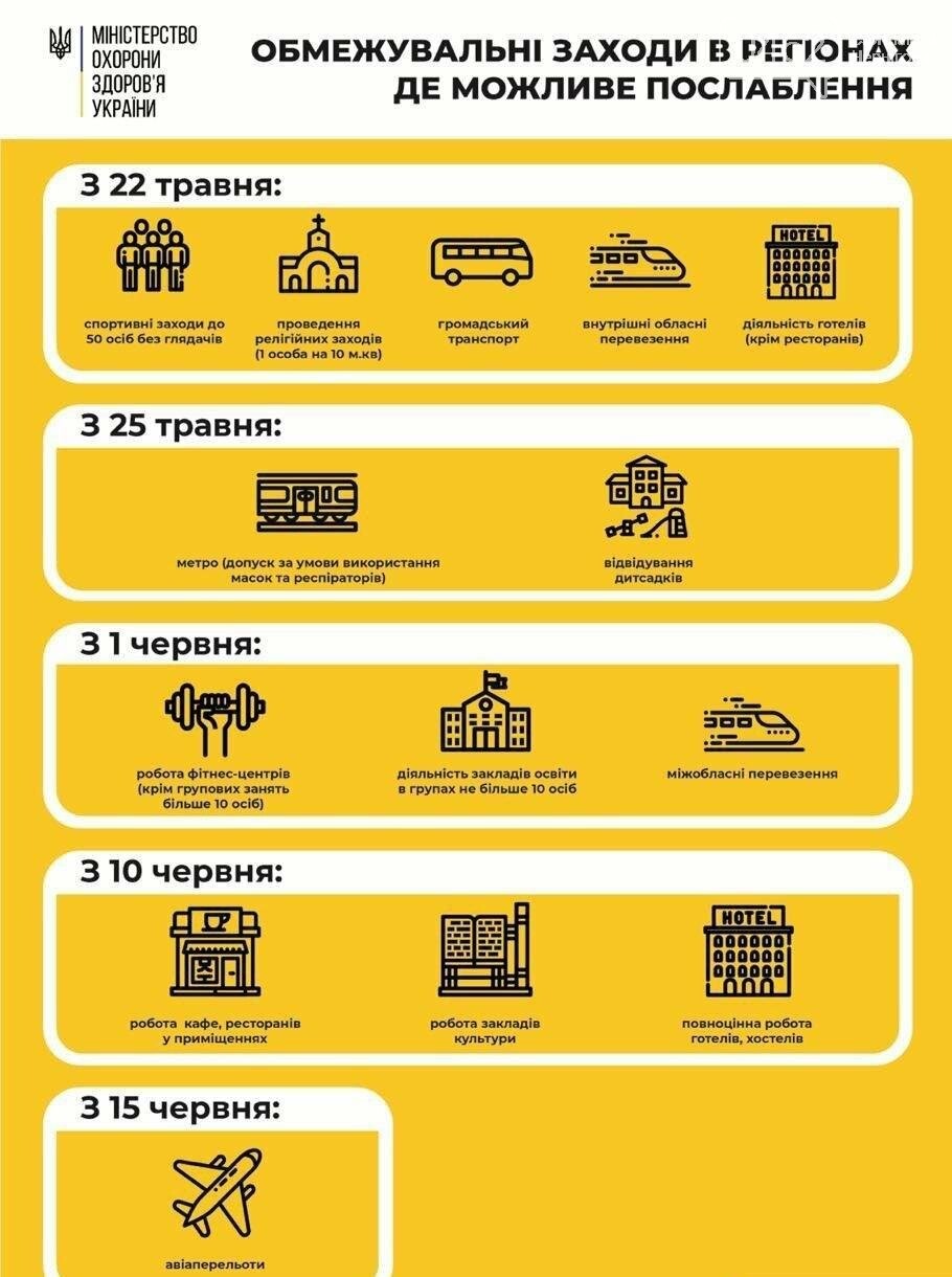 З 1 червня заплановано дозволити роботу фітнес-центрів (крім групових занять від 10 осіб та більше), закладів освіти (групи не більше 10 осіб). Також хочуть відновити міжобласні перевезення.
