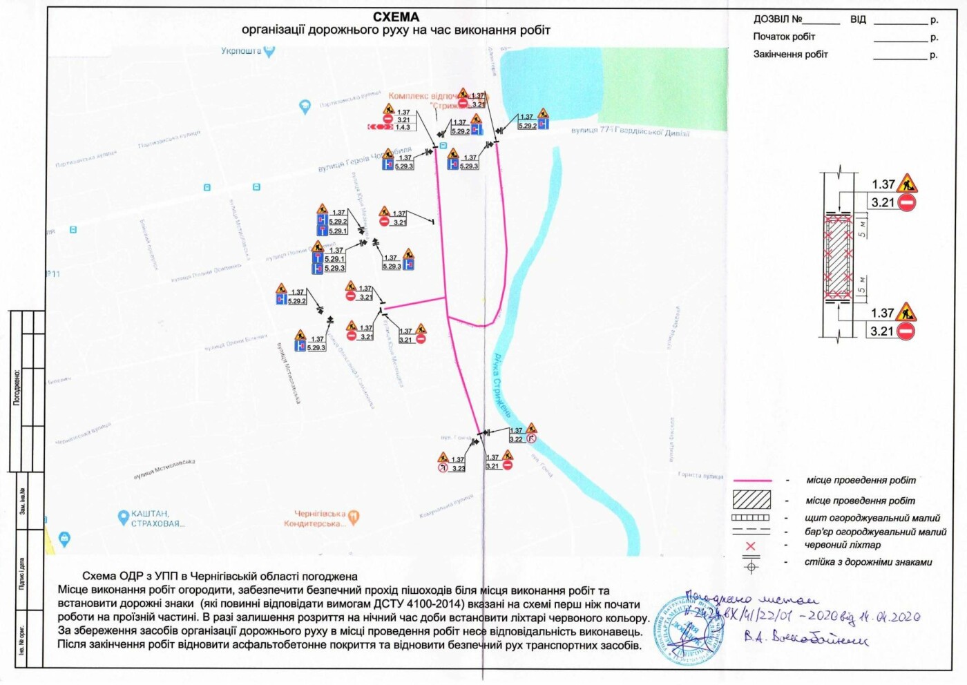 Підрядною організацією, відповідно до укладеного договору, буде встановлено дорожні знаки згідно зі схемою організації дорожнього руху, погодженою в управлінні патрульної поліції в Чернігівській області.