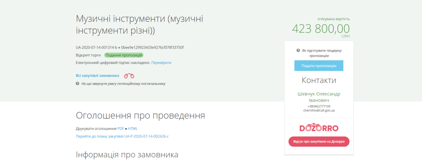 Управління культури та туризму Чернігівської міської ради оголосило черговий тендер на порталі публічних закупівель «Prozorro». На цей раз планується закупити 6 музичних інструментів для чернігівських музичних шкіл та шкіл мистецтв.