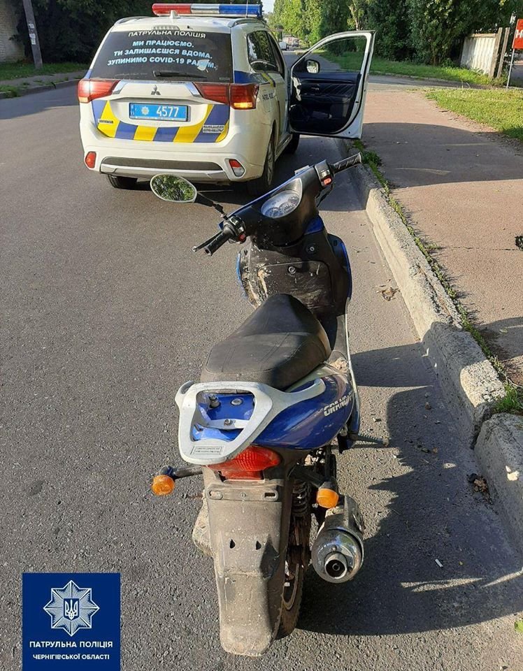 На 24-річного чернігівця охоронці порядку склали ряд адміністративних матеріалів: протокол за ч.1 ст. 130 (керування у стані сп’яніння) та постанови за ч. 6 ст. 121 (керування транспортним засобом не зареєстрованим в установленому порядку), за ч. 5 ст. 121 (порушення правил користування мотошоломами), за ч. 2 ст. 126 (керування транспортним засобом особою, яка не має права керування) та за ч. 1 ст. 126 ( керування транспортним засобом особою, яка не має при собі реєстраційного документа) Кодексу України про адміністративні правопорушення.
