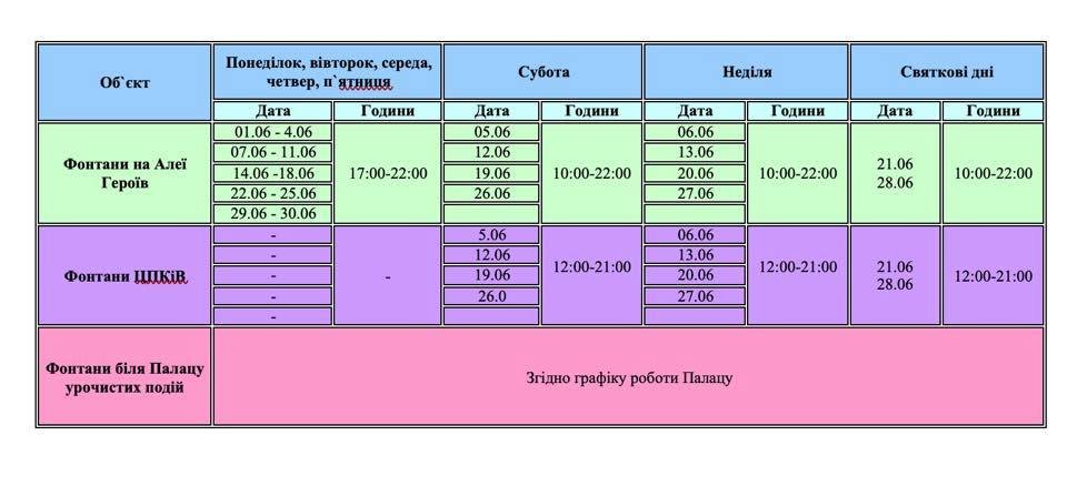 Більшість із них, в будні, працюватимуть з 17:00, до 22:00. В той же час у вихідні та святкові дні вони працюватимуть на декілька годин довше. А саме – з 10:00, до 22:00. Однак, зазначається, що в дощову та вітряну погоду, фонтани не працюватимуть.