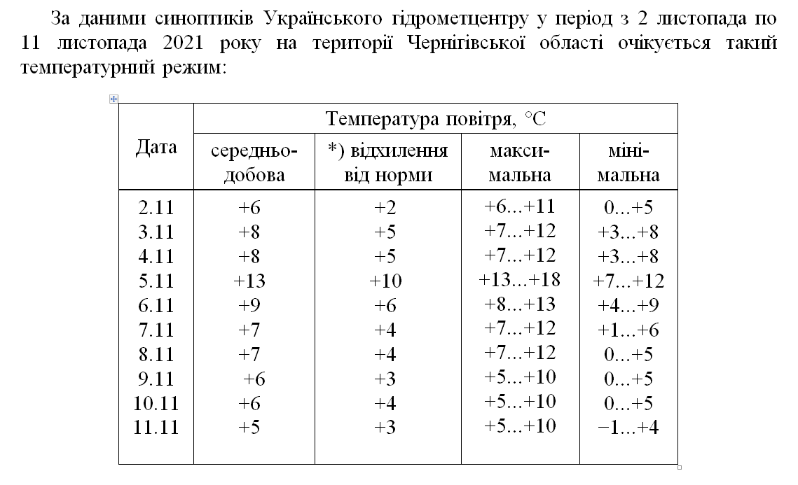 Детальний прогноз погоди по Чернігівській області на період з 2 по 11 листопада.