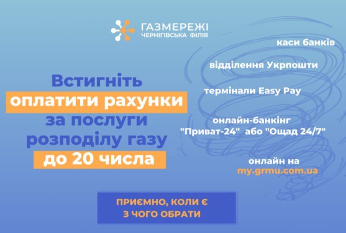 Нагадуємо, що сплатити за послугу розподілу природного газу потрібно до 20-го числа поточного місяця!
