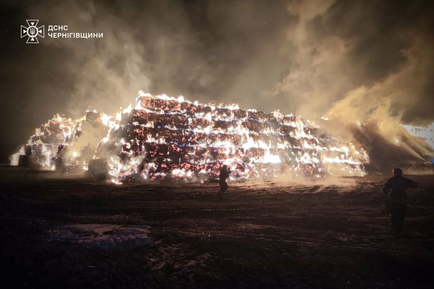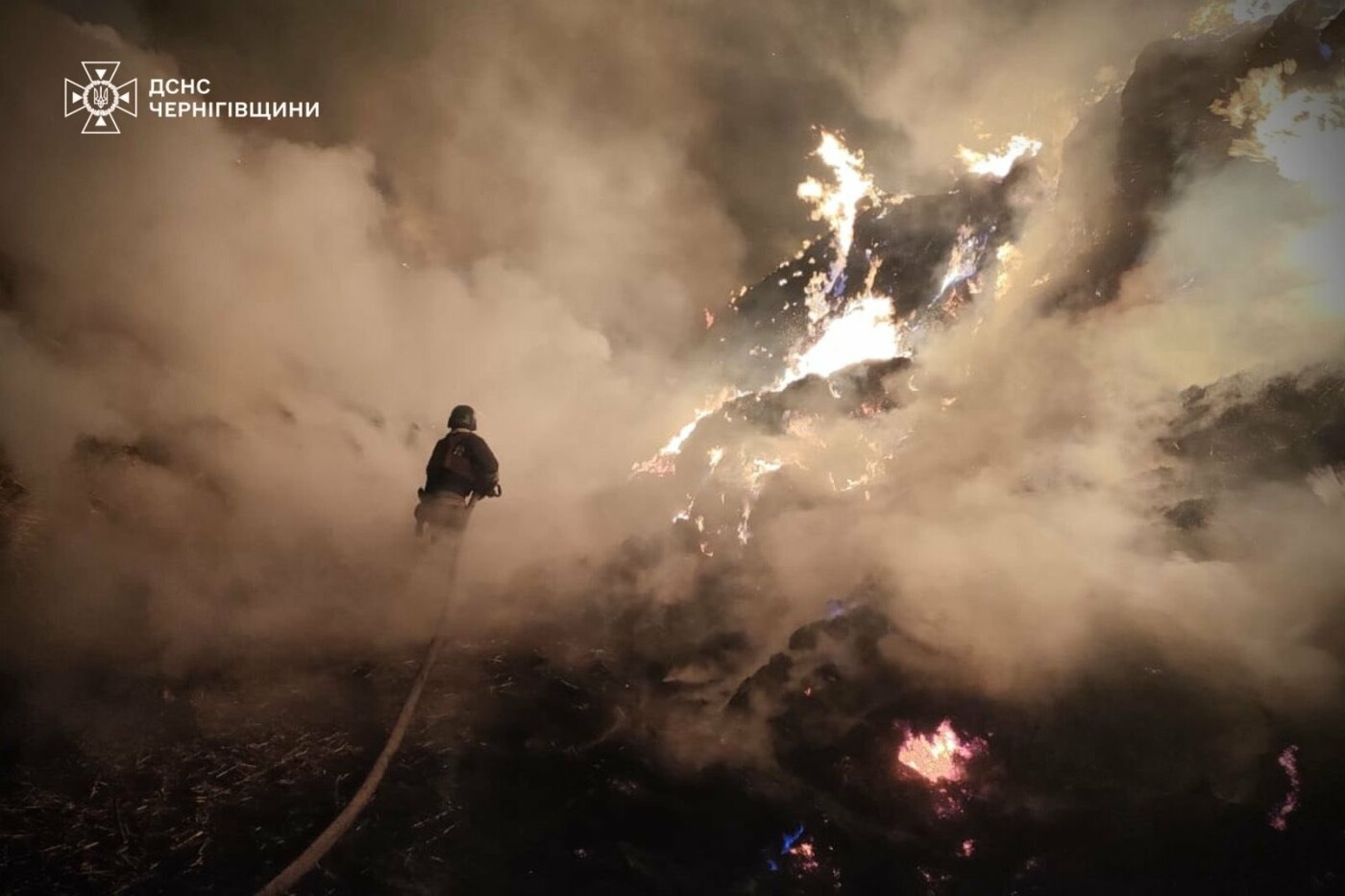 У Корюківському районі внаслідок влучання по території фермерського господарства загорілися скирди соломи на загальній площі близько 1800 кв. м. До ліквідації пожежі залучалися підрозділи ДСНС та місцева пожежна команда. Загоряння вдалося повністю ліквідувати.