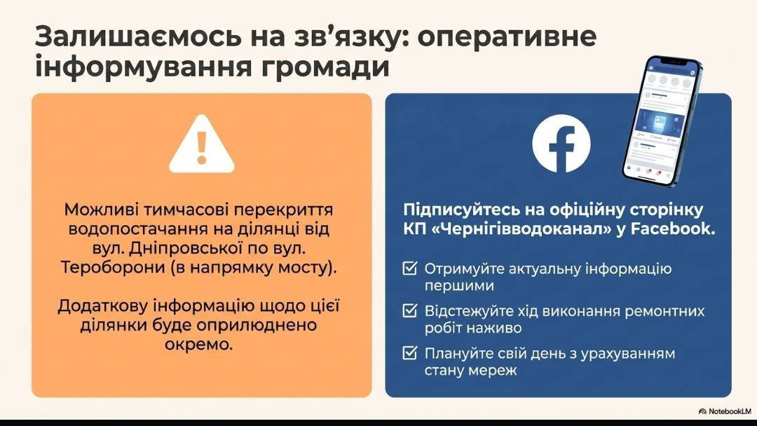 У «Чернігівводоканалі» зазначають, що щодо можливого перекриття водопостачання на ділянці від вулиці Дніпровської по вулиці Тероборони в напрямку мосту додаткову інформацію повідомлять окремо.